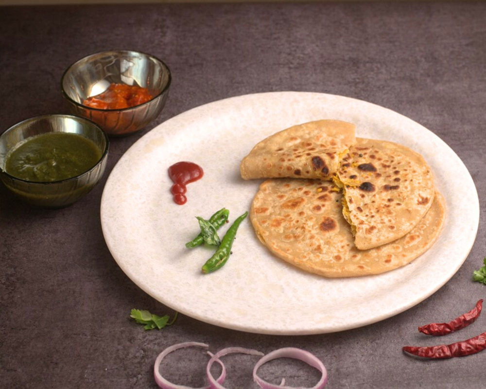 MAGICALLY POTATO , PANEER AND SATTU FILLED IN WHEAT FLOUR BOLLS. FLAVOURED BY HOME MADE GHEE.